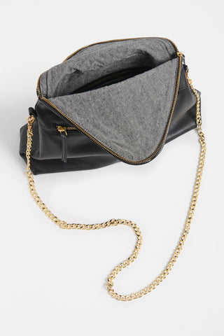 The Dreii Crossbody Bag is a mid-sized design with contrast heavyweight zip detailing in a striking geometric pyramidal shape. Two main zip openings provide practical multiple openings, while the detachable gold chain strap offers styling versatility from crossbody to evening clutch