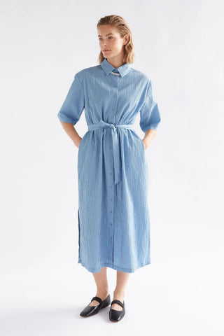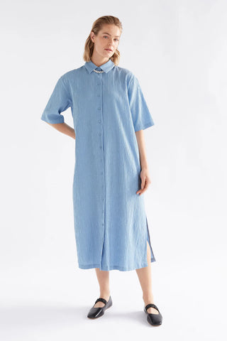 The Erden Shirt Dress is a midi to long, short sleeve shirt dress crafted from a speciality soft, yet crisp, fine pinstripe, seersucker organic cotton with a textured hand feel. Timeless detailing includes a classic shirt collar with button-through placket and short boxy sleeves with dropped shoulders that create a relaxed appeal. Finished with back yoke decorative shirring and gathers for added interest and comfort. Cinch the waist with the optional belt and add jewellery to elevate for evening or wear relaxed without the belt and slides for a relaxed weekend look