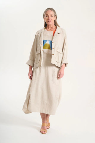 Designed to sit comfortably at the waist with an elasticated back and flat front waistband, this skirt is both flattering and practical, ready to pair with matching linen jackets or printed cotton tops.